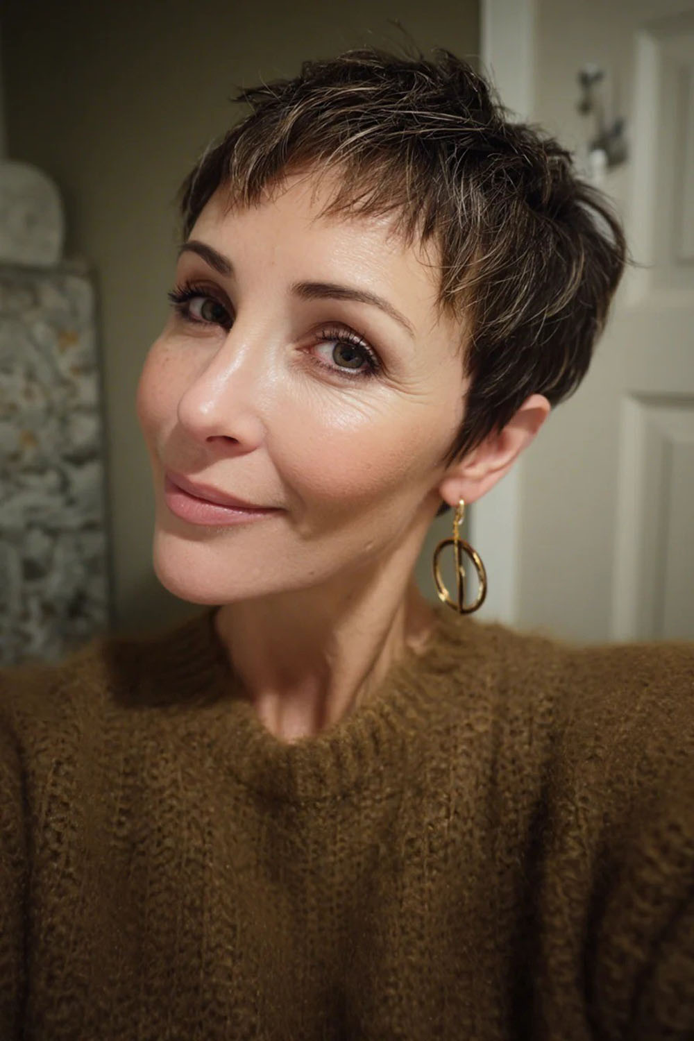 Trumpas kirpimas su charakteriu, bet be griežtumo. Tekstūra suteikia apimties ir lengvumo, o šaltas pelenų kaštono atspalvis atrodo moderniai ir tauriai.