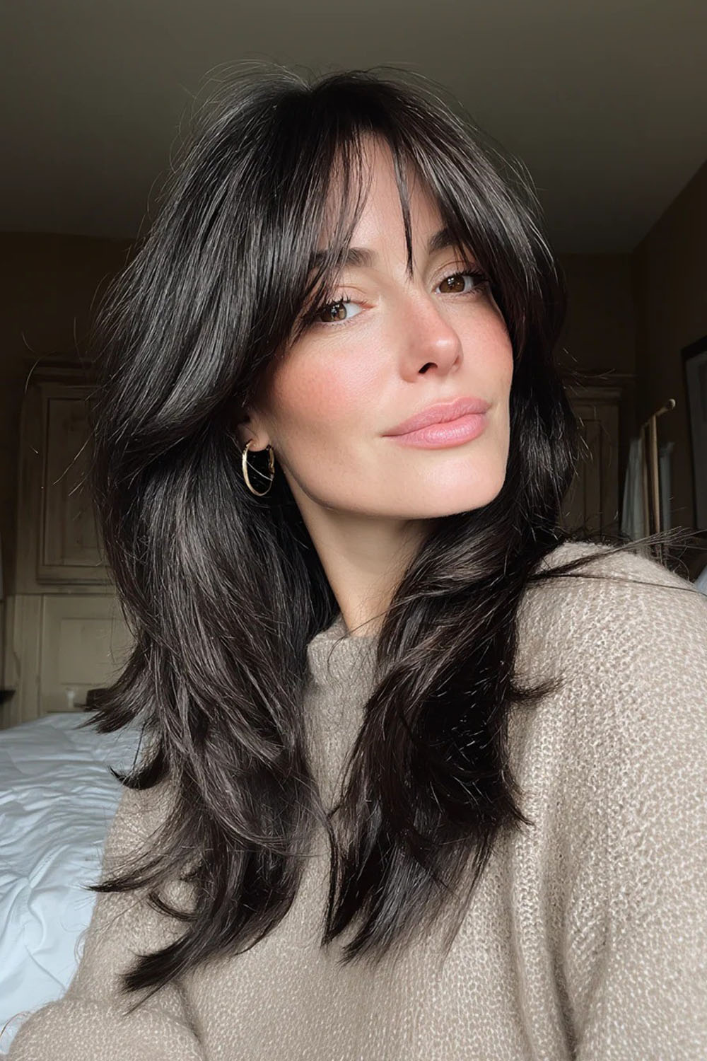 Sluoksniuotas kirpimas su „užuolaidų“ tipo kirpčiukais ir natūralia juoda spalva