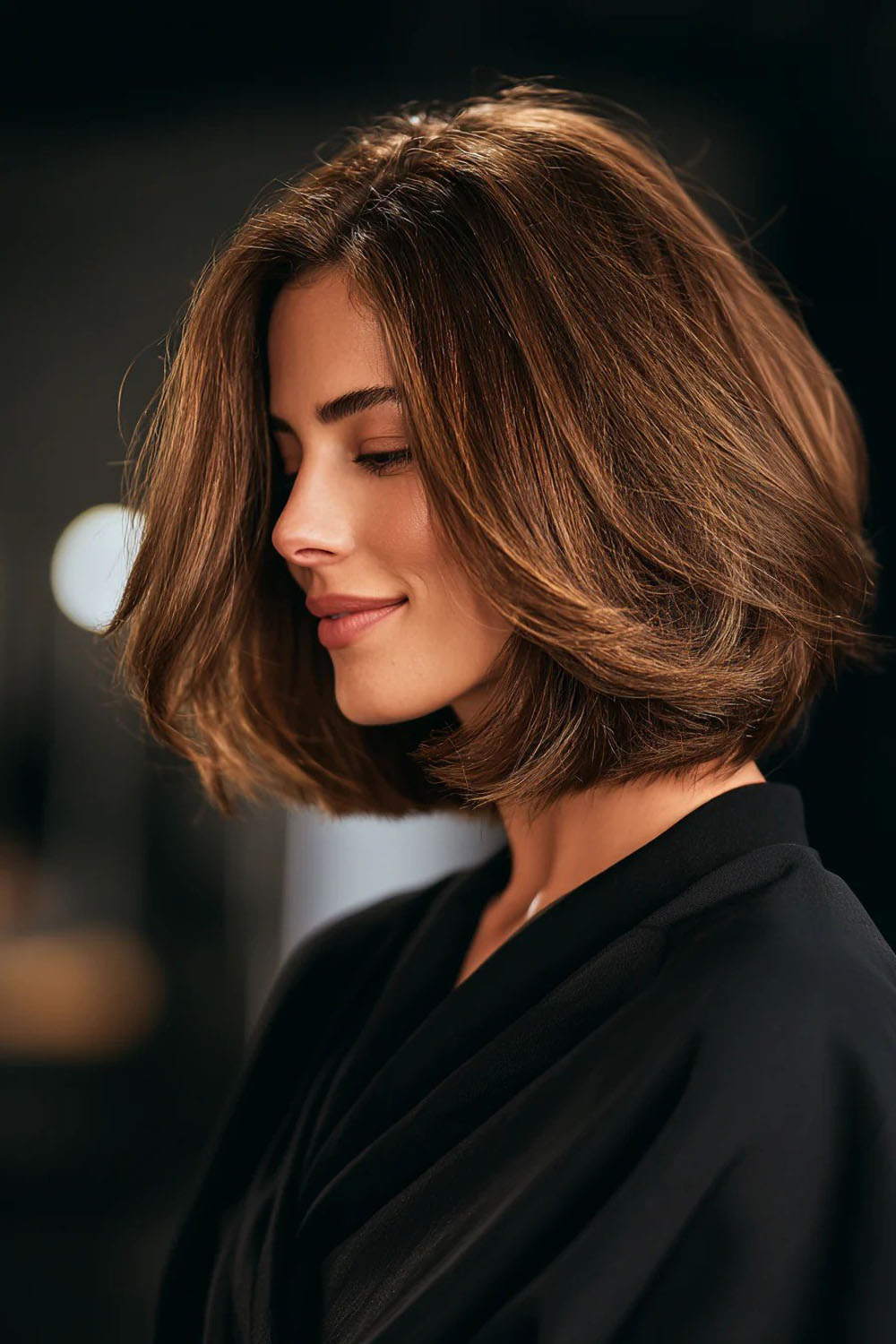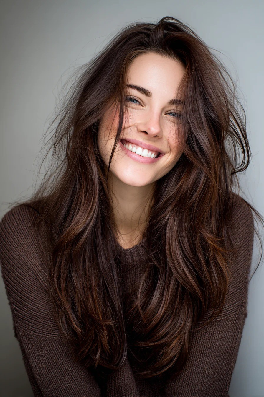 Jei gaila kirpti ilgį, dažnai pakanka jį sumaniai atnaujinti. Minkšti sluoksniai suteikia judesio, o tamsaus šokolado atspalvis daro plaukus blizgančius ir vizualiai tankesnius.