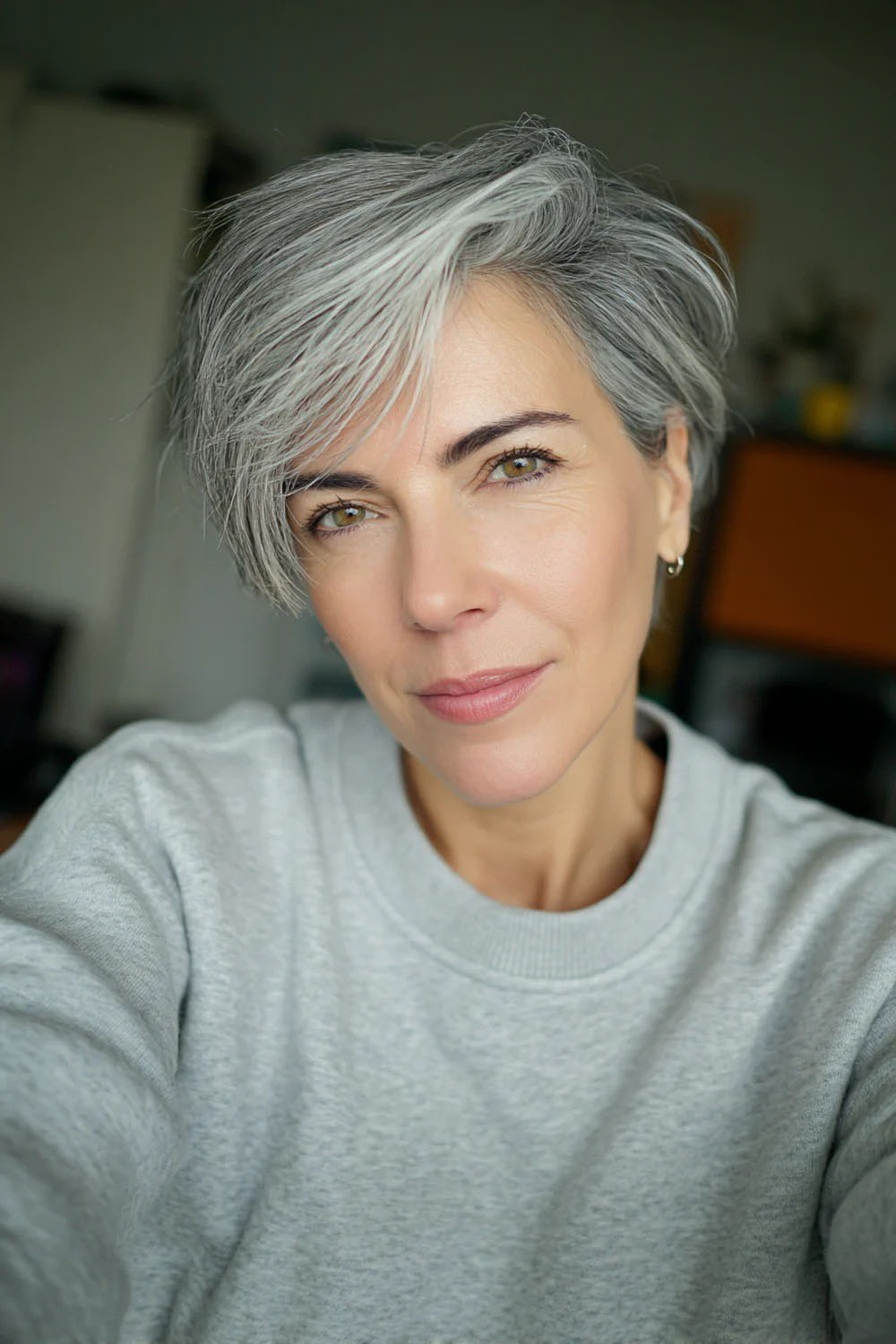 Labai gražus variantas toms, kurios nenori slėpti natūralios spalvos. Žilų ir tamsių sruogų derinys atrodo stilingai, o piksi-bobo forma suteikia plaukams apimties.