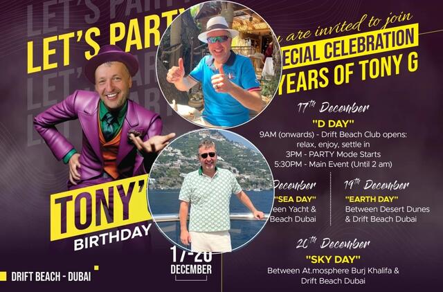 A.Guoga išsiuntinėjo svečiams kvietimus su savo atvaizdu ir prierašu „Tony's Birthday“. Nurodoma, kad gruodžio 17-ąją prasidėsianti šventė tęsis iki gruodžio 20 dienos.