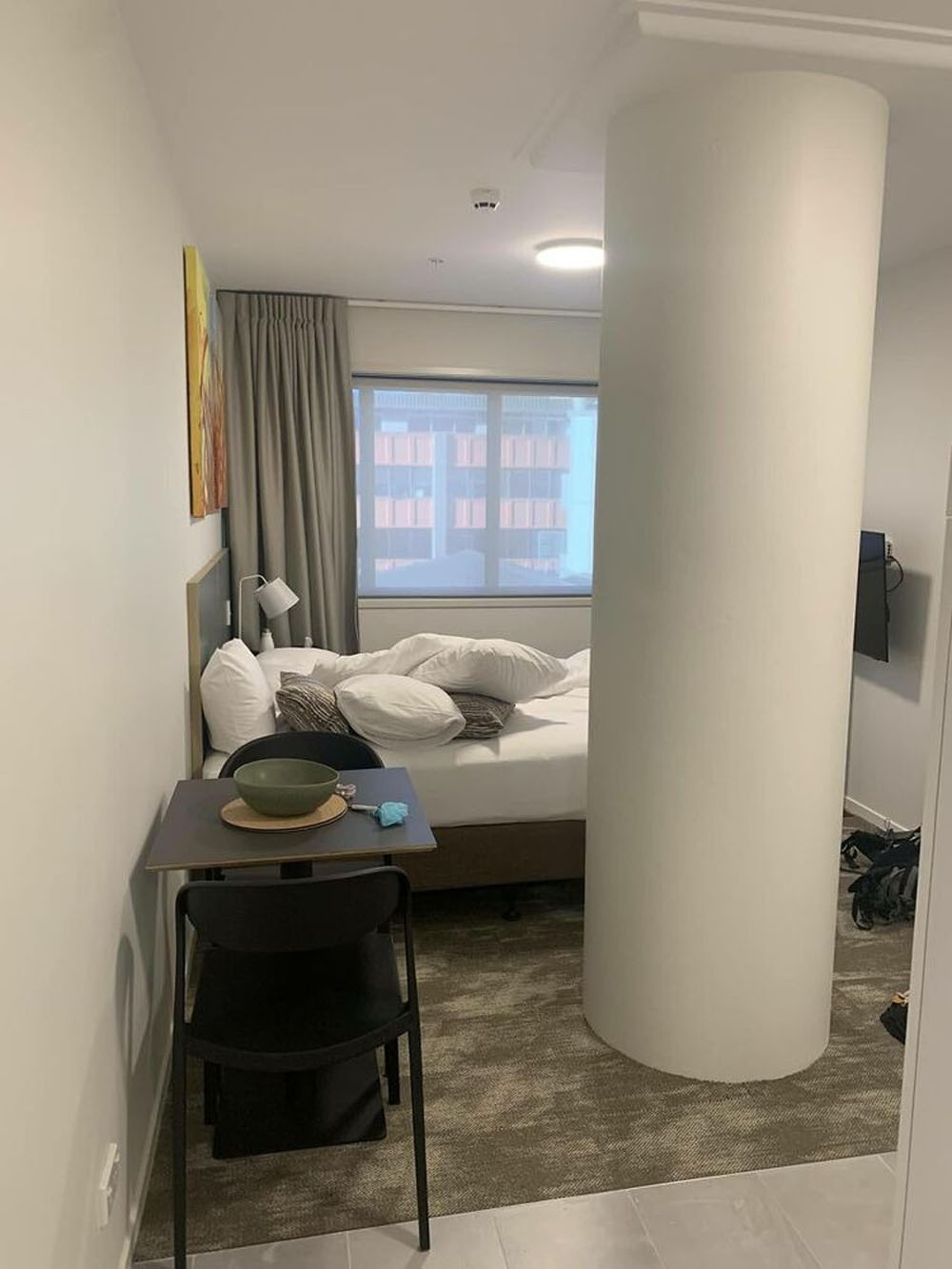 Įsivaizduokite: užeinate į savo numerį Velingtone ir atsiremiate į milžinišką betoninę atramą tiesiog vidury kambario. Tai ne klaida, tai „laikantysis stiliaus elementas“.