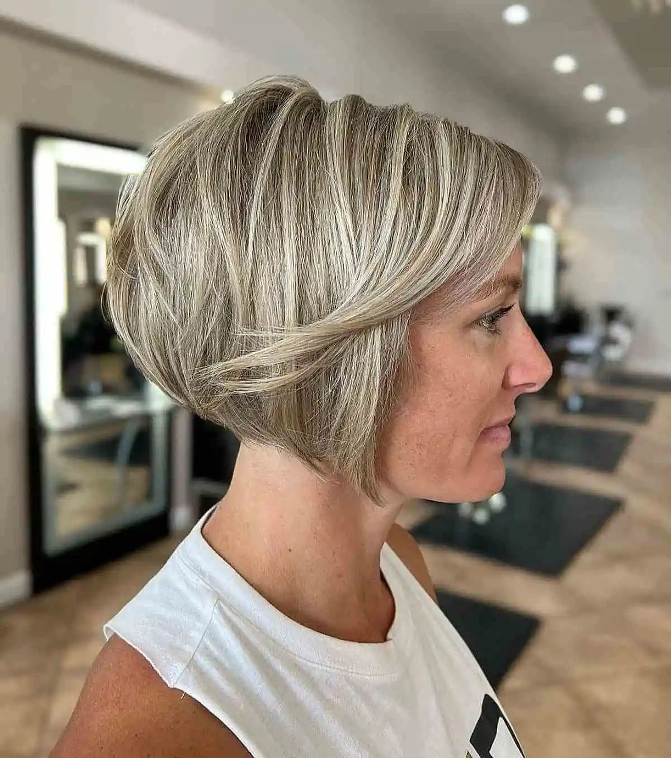 Paprastai su amžiumi plaukai pradeda retėti. O trumpos šukuosenos juos padaro tankesnius. Taip pat galite padidinti ilgį, išlaikydami kampą priekyje.