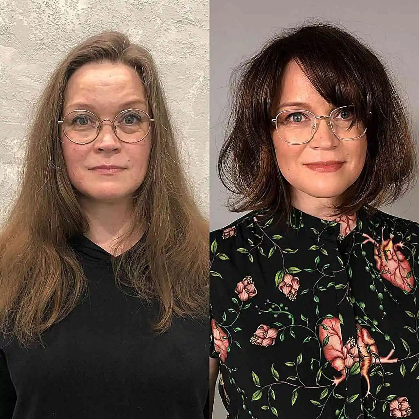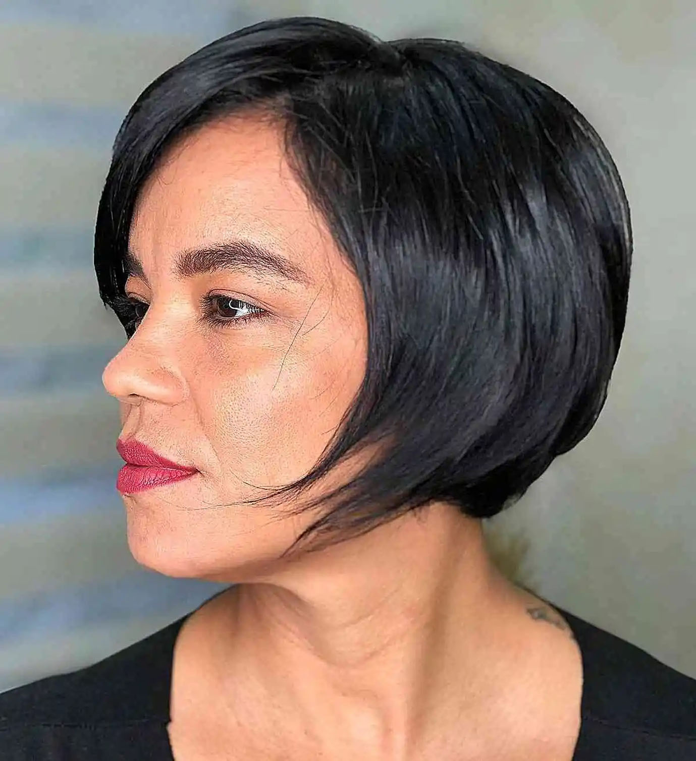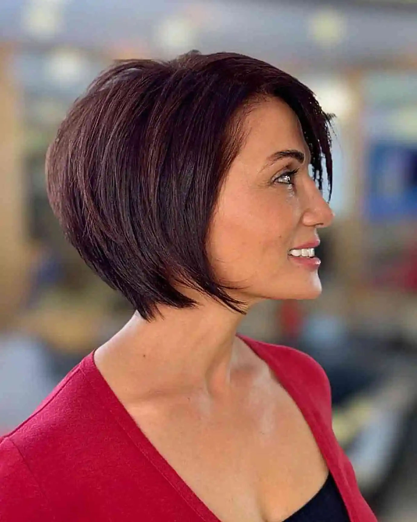 Tamsiai rudos spalvos bob su šoniniu skyrimu idealiai tinka moterims, vyresnėms nei 40 metų. Ši šukuosena taip pat labai lengvai sušukuojama, todėl visada atrodysite stilingai.