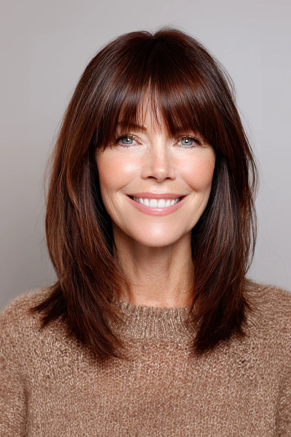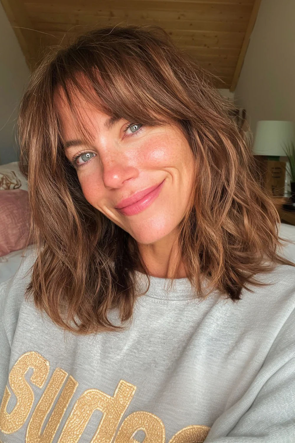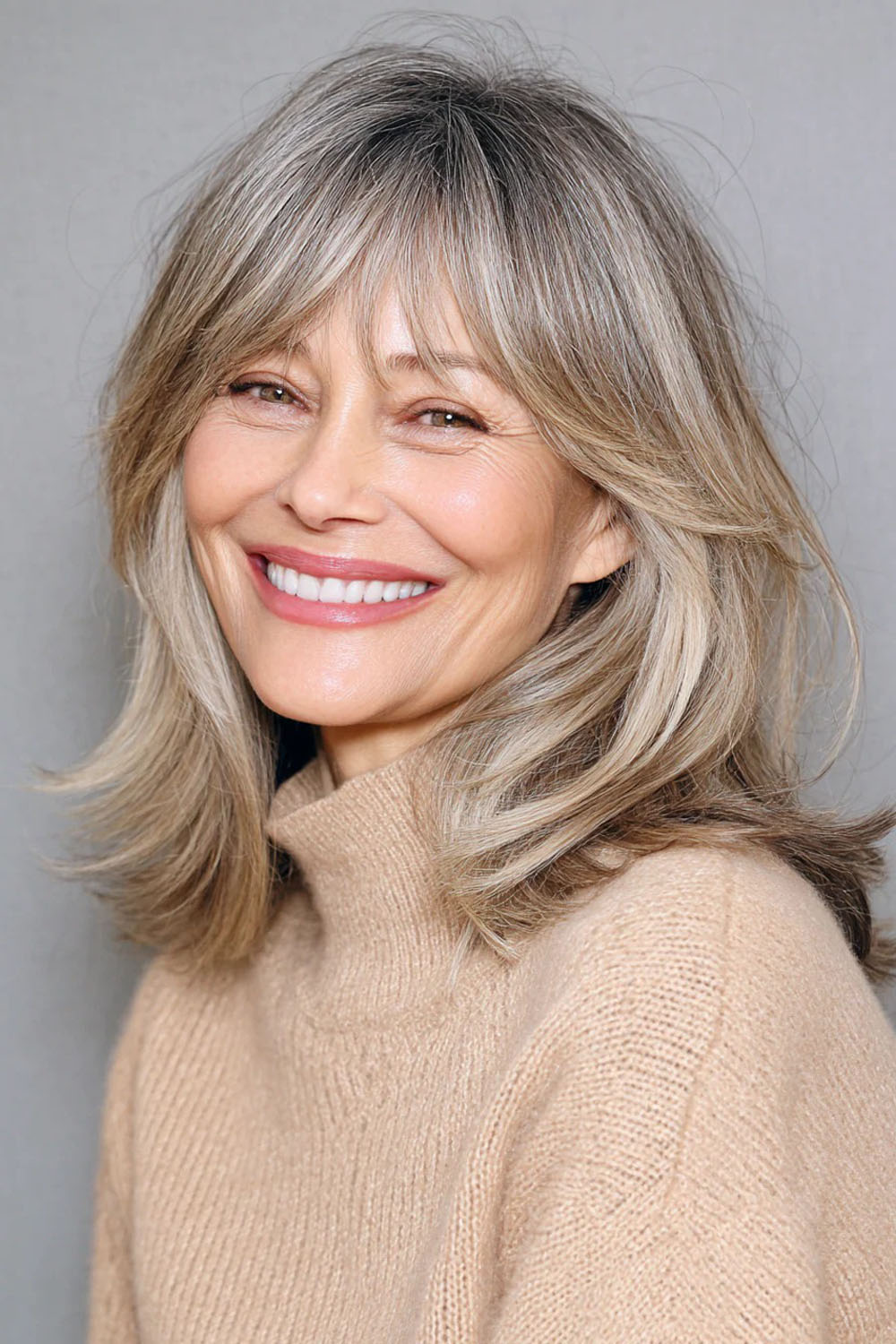 Šiltas karamelinis atspalvis sušvelnina odos toną, o šoniniai užuolaidiniai kirpčiukai lengvai įsilieja į bendrą ilgį. Į šoną nukreipti kirpčiukai suteikia „liftingo“ efektą, ypač jei sklastymas nėra griežtai centre. Sluoksniai prideda apimties nereikalaujant sudėtingo formavimo.