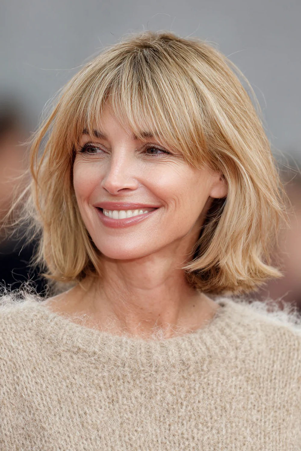 2) Ilgas bobas su lengvai į išorę pasuktais galiukais ir kirpčiukai iki antakių (šampano blondinė)