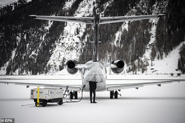 Nuotraukoje: privatus lėktuvas Engadino oro uoste per 55-ąjį Pasaulio ekonomikos forumo (WEF) metinį susitikimą Samedane, Šveicarijoje, 2025 m. sausio 22 d.