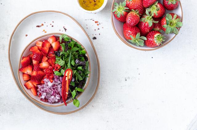 „Saldžiarūgštis braškių skonis, susijungęs su pipirų kartumu, suteiks patiekalui įdomaus prieskonio. Galite įpjaustyti dar ir avokado ar saldžiosios paprikos.