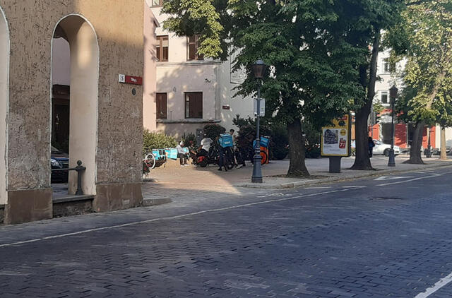 Dažniausiai dviračiais ir elektriniais motoroleriais po miestą su kuprinėmis ant pečių nardantys jaunuoliai čia laukia, kol netoliese esančiose kavinėse bus paruošti klaipėdiečių užsisakyti patiekalai.