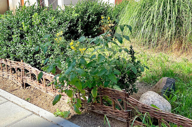 Šalia išpuoselėto darželio ir žolynėlio, prie dailiai supintos tvorelės žydi... pomidoras.