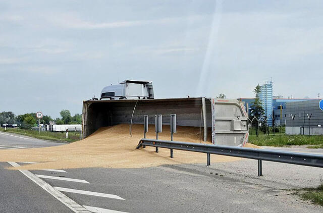 Sunkvežimiui išsukant iš Laisvosios ekonominės zonos (LEZ) teritorijos jo priekaba daliai prigulė ant kairiojo šono ir Vilniaus plento atkarpa paukščiams tapo grūdais nuklotu didžiuliu vaišių stalu.