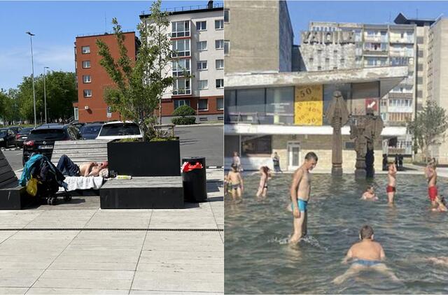 Vieni sau pliuškenasi ir gaivinasi šios aikštės fontane, nepaisydami ženklų „Maudytis draudžiama“, o kiti iki pusės išsinuoginę ramiai sau įsitaisę gaudo saulės spindulius.