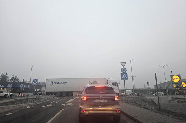 Tik retas į šiuos prekybos centrus prekes atvežusio vilkiko vairuotojas sugeba iš jų aikštelių, apsukęs beveik visą žiedą, išsukti tiesiai į kelią.