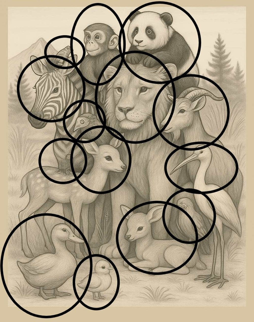 Sekundės bėga greičiau, nei atrodo. Jau radote liūtą, beždžionę, pandą, zebrą? Puiku, bet neatsipalaiduokite: kažkur žolėje slepiasi pora elnių, o kampe – mažas paukštelis, kurį lengva palaikyti lapeliu.