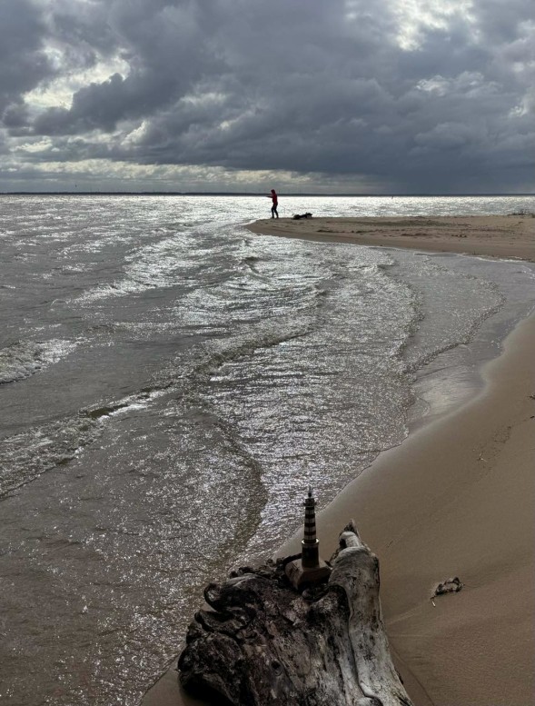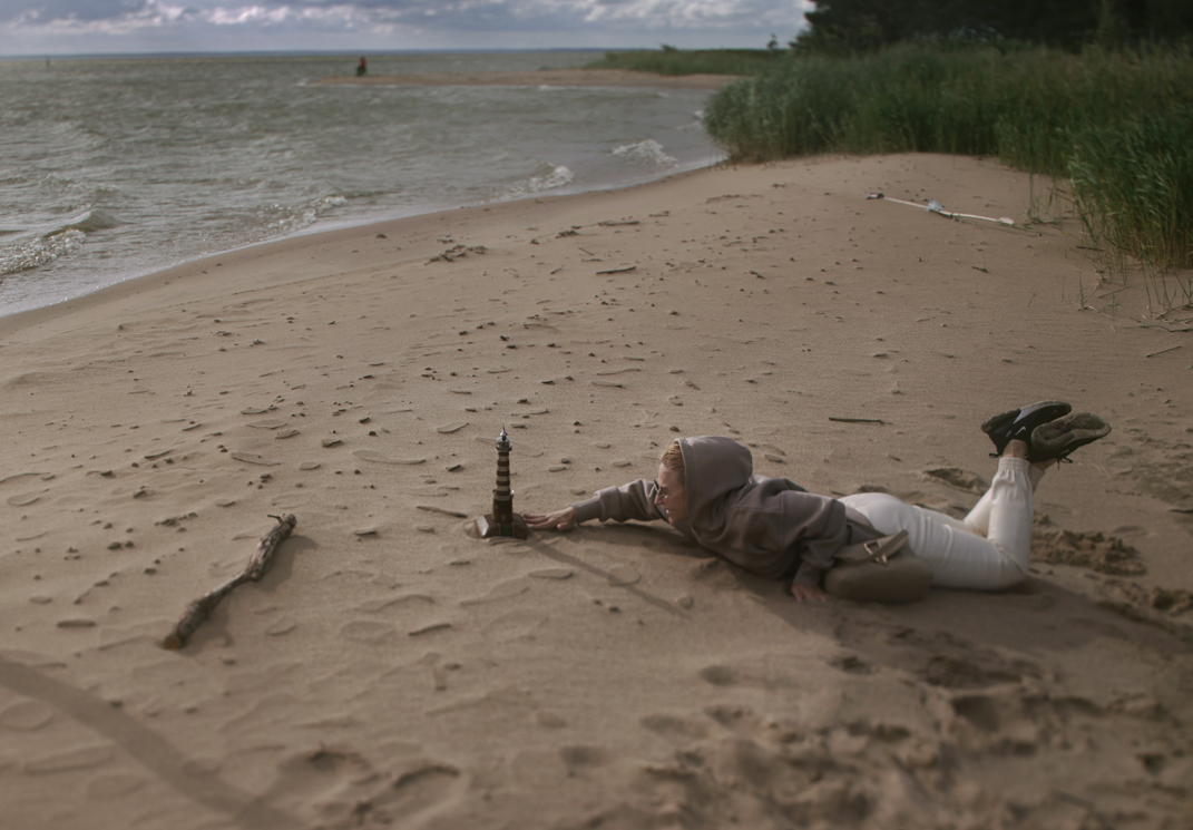 Vėjas gainiojo marių bangas, mums žingsniuojant pakrante. Pasiūliau prigulti ant smėlio. Švyturys telpa delne, tad jo didybei akimis suvokti verta žiūrėti iš apačios į viršų, visu ūgiu išsitiesus ant žemės.