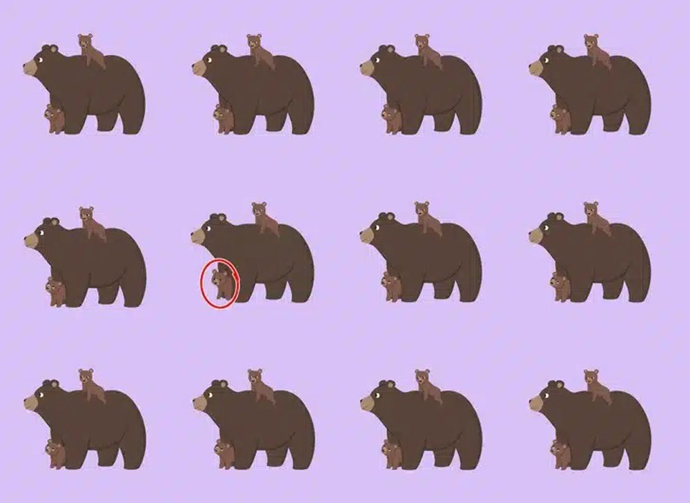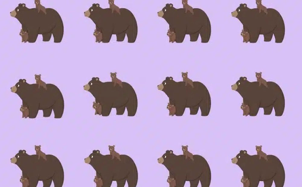 Taigi, ar esate pasiruošę išbandyti save? Atidžiai pažiūrėkite į paveikslėlį ir pabandykite rasti tą vienintelę skirtingą meškų porą.