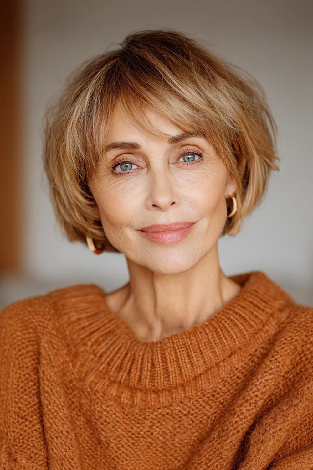 Šiltas karamelinis atspalvis sušvelnina kirpimą ir suteikia veidui šviesumo. Dėl sluoksnių trumpas bobas atrodo apimtesnis, o plaukai įgauna gražaus gylio ir gyvybingesnę formą.