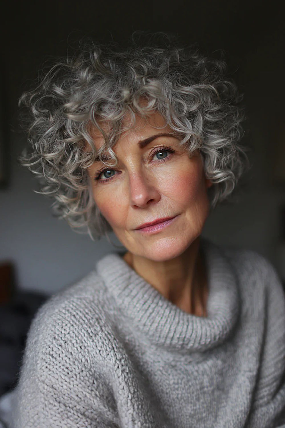 Trumpas kirpimas, pritaikytas natūralioms garbanoms, visada laimi dėl taisyklingos formos. Pilkas atspalvis pabrėžia garbanų tekstūrą, o ilgis padeda išlaikyti jų stangrumą bei judrumą.