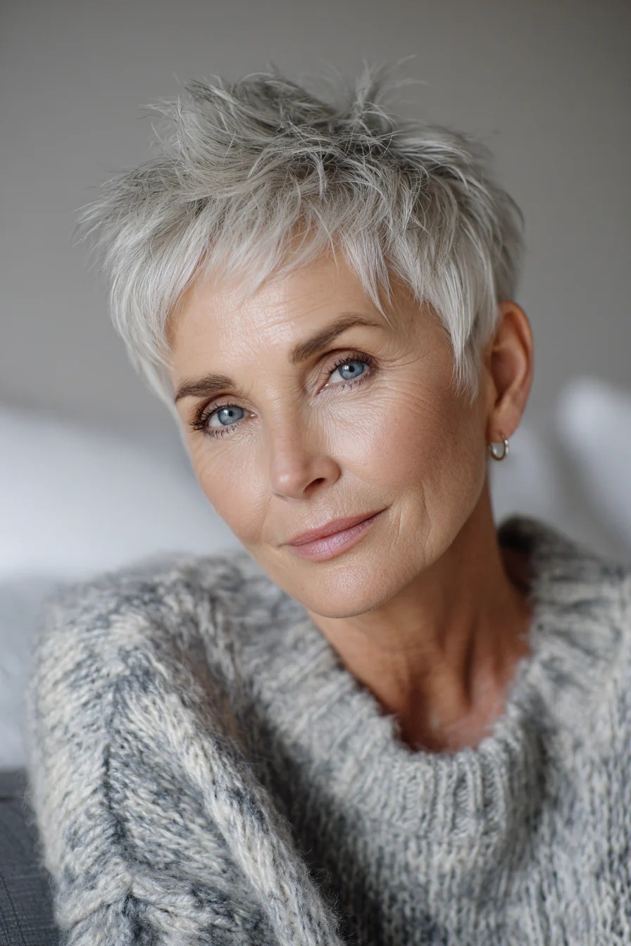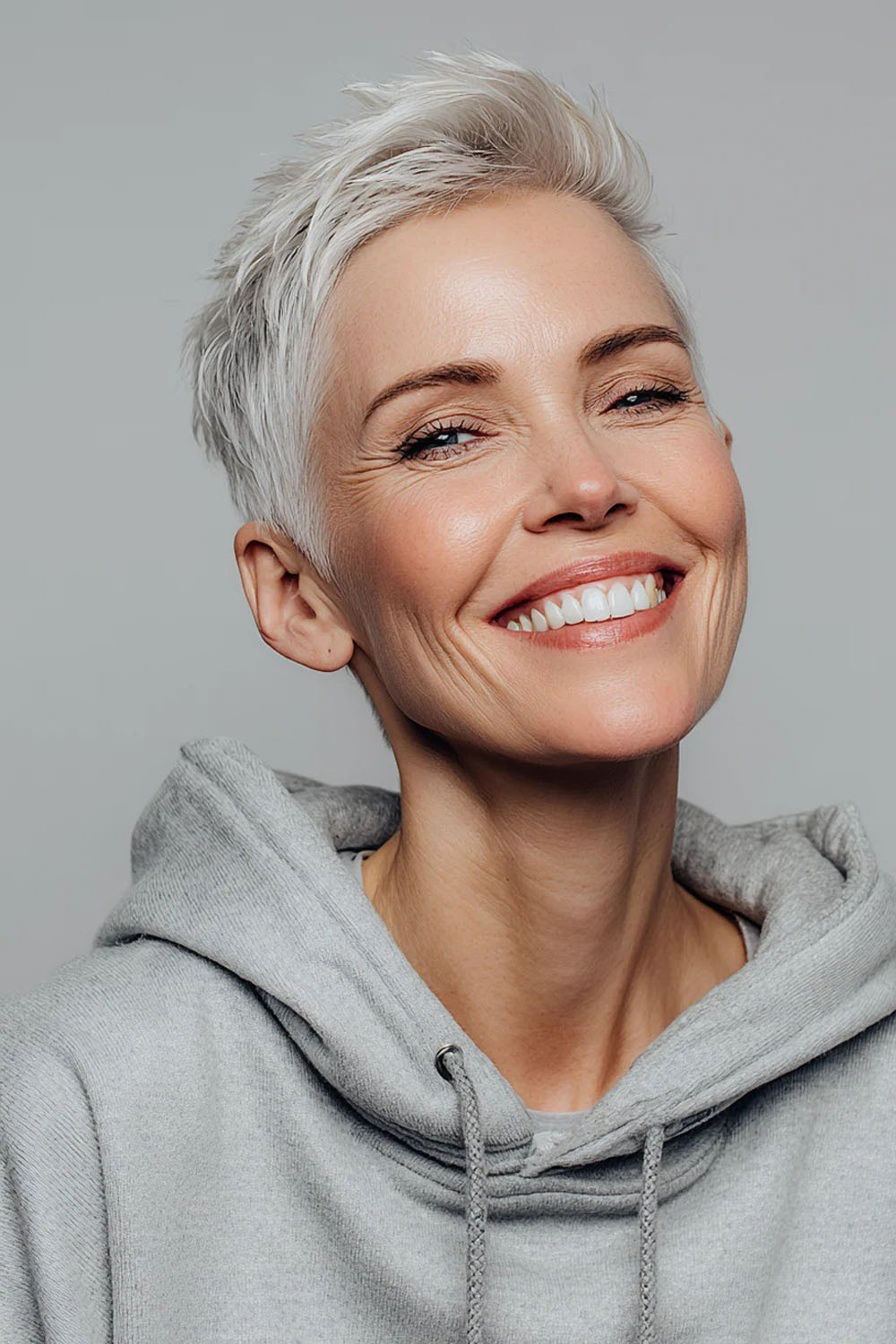 Minimalaus sluoksniavimo platininis „pixie“ atrodo tvarkingai, švariai ir labai tiksliai. Tai atvejis, kai trumpas kirpimas laikosi ant tikslios formos ir suteikia išbaigtumo efektą be jokio sunkumo.