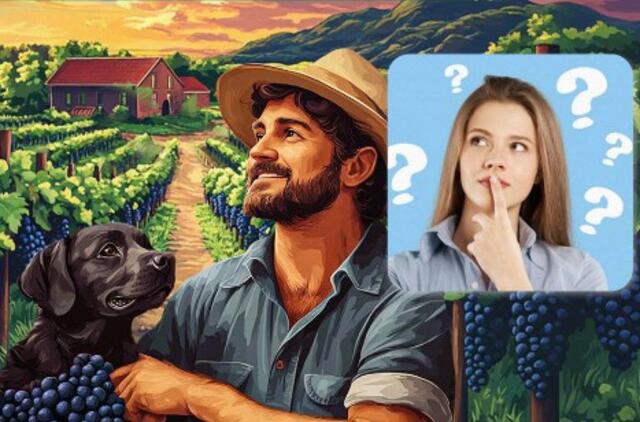 Toliau matysite vynuogyno, kuriame vyras skina vynuoges, vaizdą.
