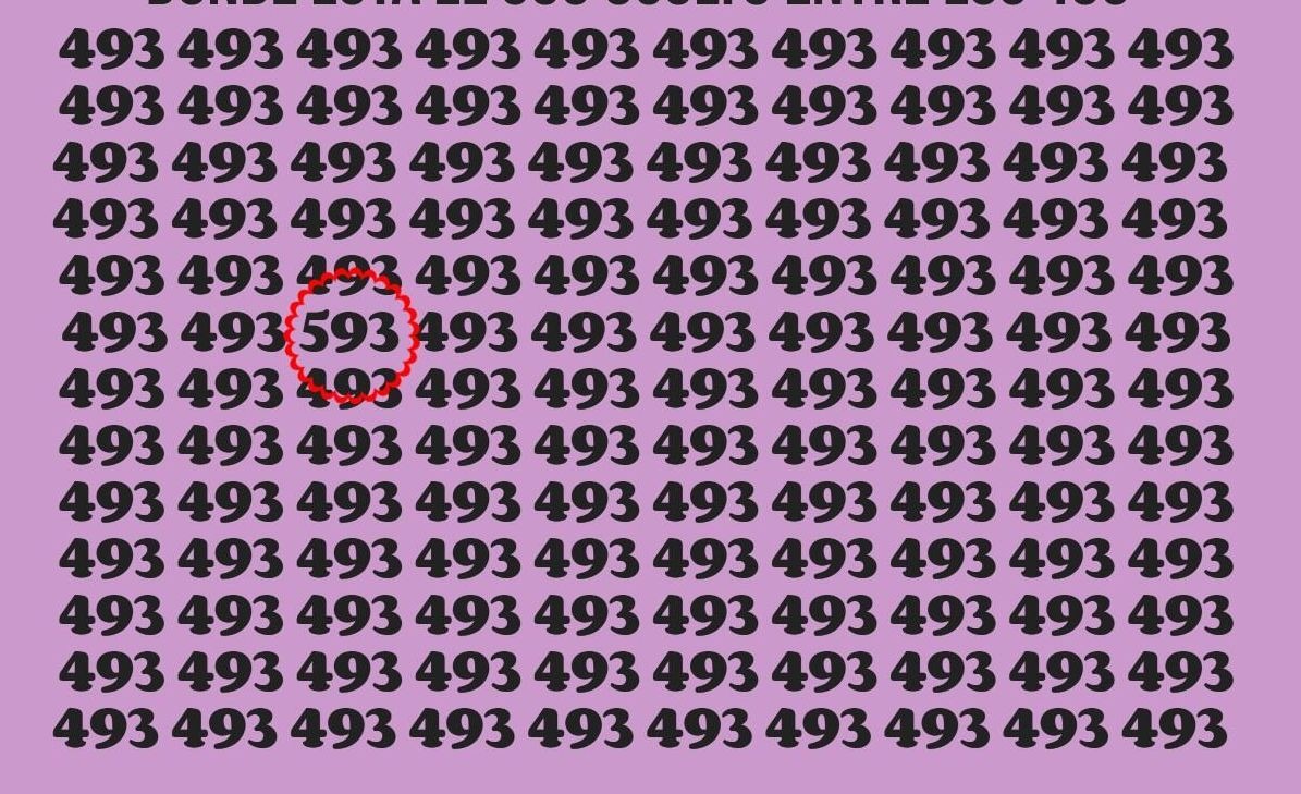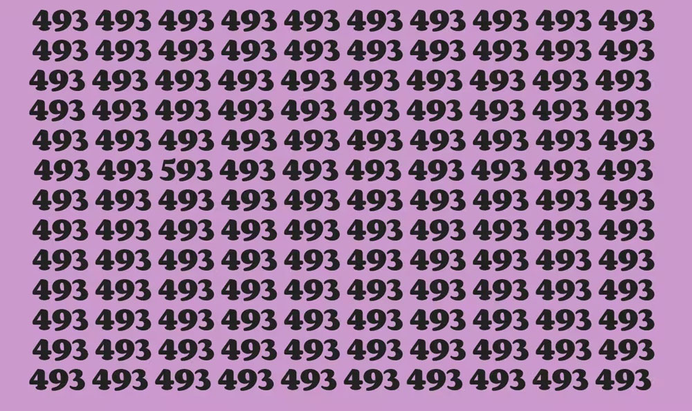 Paveikslėlyje – eilės ir stulpeliai su skaičiumi 493. Visi jie identiški, išskyrus vieną – 593, sumaniai paslėptą. Turite tik 6 sekundes, kad jį rastumėte. Pašalinkite visus trukdžius ir sutelkite visą dėmesį. Tai jūsų regos aštrumo ir informacijos apdorojimo greičio patikrinimas.