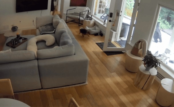 Vaizdo kameros užfiksavo, kaip gyvūnas įeina į kambarį, apuosto sofą ir jaučiasi pakankamai užtikrintai. Bet staiga kadre pasirodo trejų metų Skoutas – garsiai lodamas jis greitai puola neprašytą svečią.