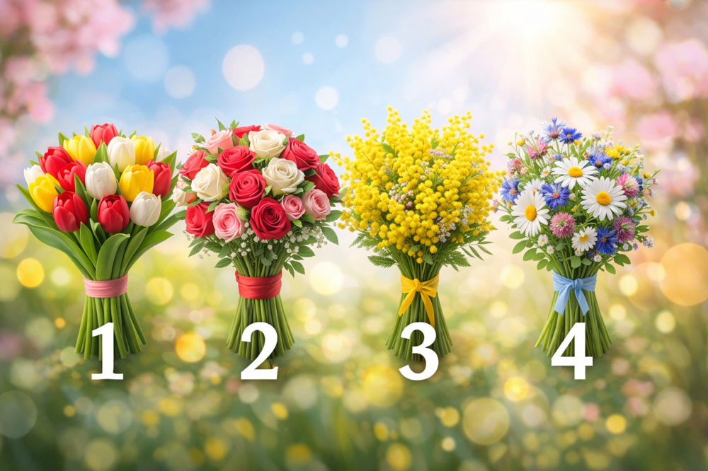 Pažvelkite į keturias puokštes ir išsirinkite tą, kuri jums patinka labiausiai. Per ilgai neanalizuokite. Pasirinkite tą puokštę, kuri pirmoji patraukė jūsų dėmesį. Įsiminkite numerį ir žemiau perskaitykite paaiškinimą.