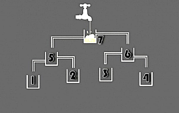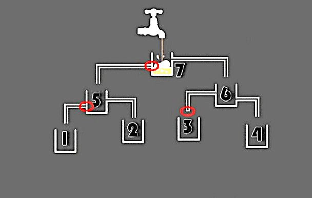 Šiame teste keletas stiklinių yra sujungti tarpusavyje vamzdeliais. Į sistemą iš čiaupo įleidžiamas vanduo, o jūsų užduotis – nustatyti, kuris stiklinis užsipildys pirmas.