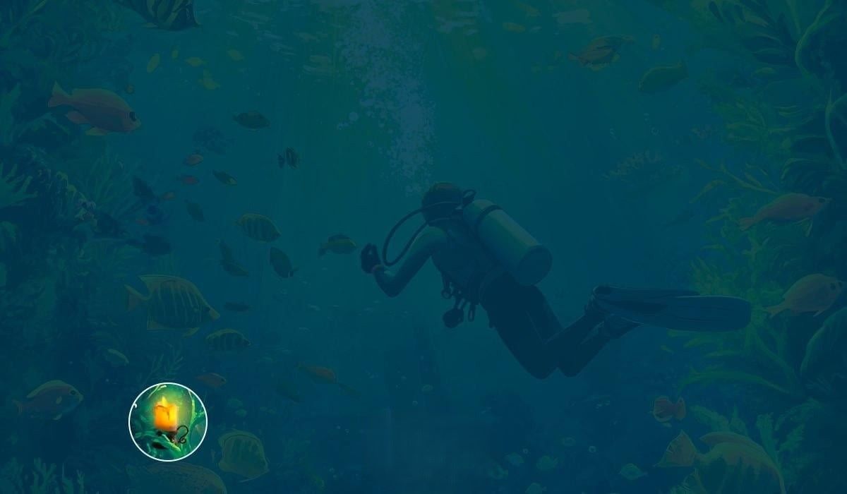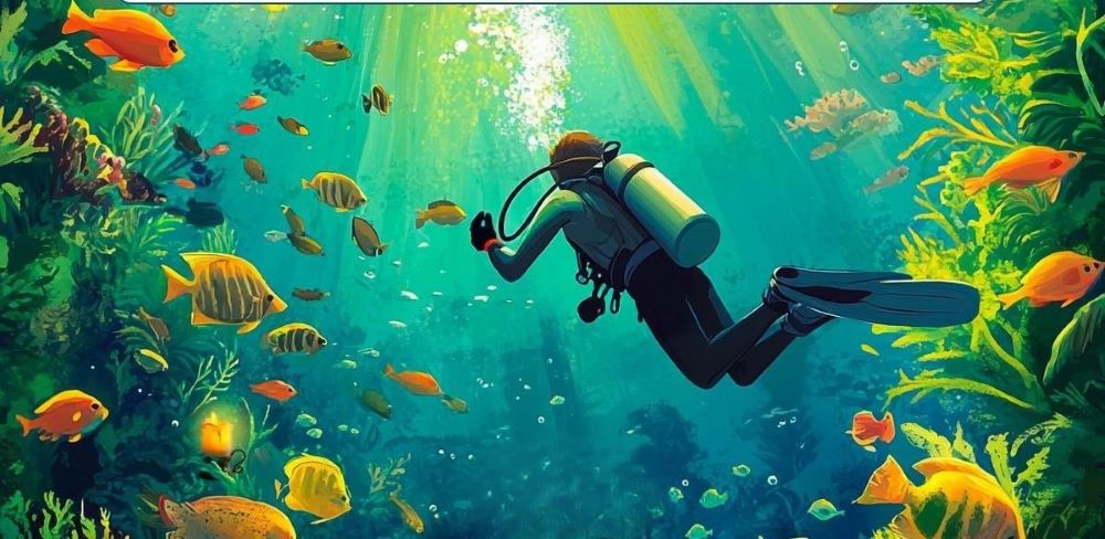 Paveikslėlyje pavaizduotas povandeninio kraštovaizdžio viduryje esantis naras.