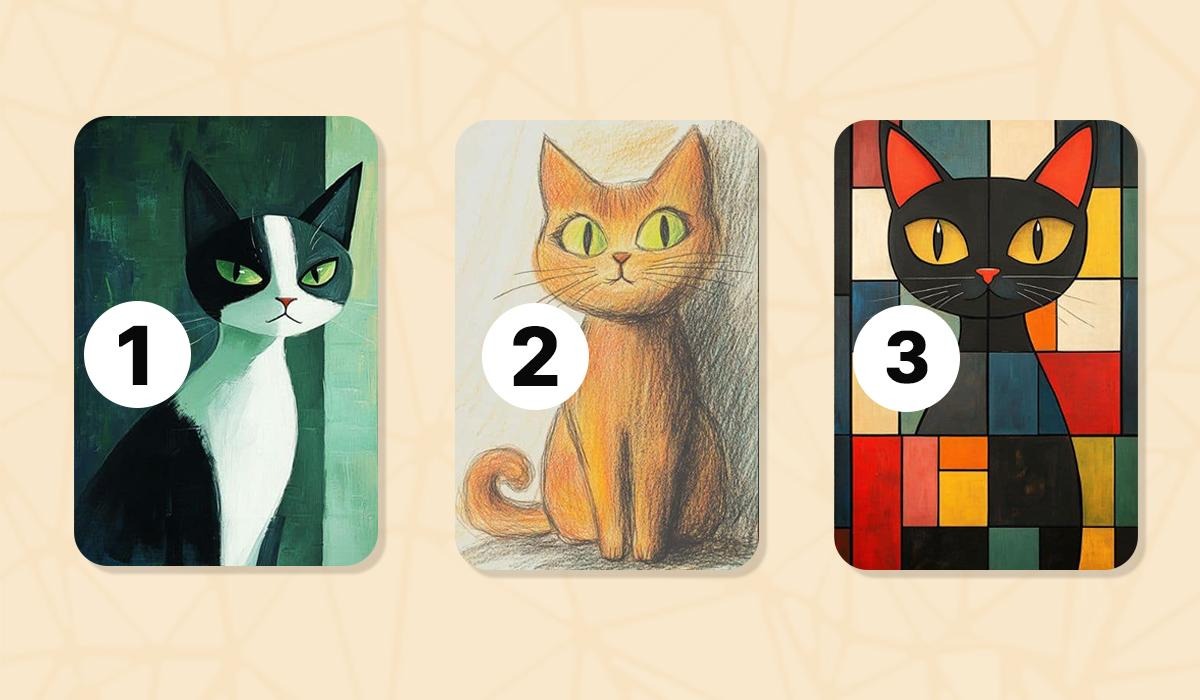 Jums tereikia pažvelgti į tris skirtingus kačių (arba kačiukų - nesvarbu, kas jums labiausiai patinka) paveikslėlius ir išsirinkti tą, kuris jums labiausiai asocijuojasi.