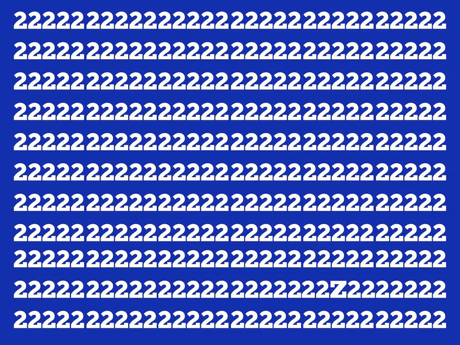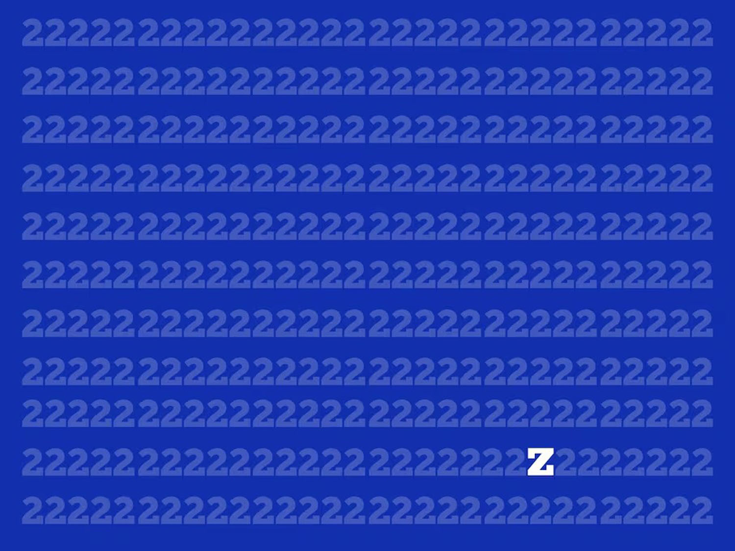 Prieš jus – gudrus vizualinis galvosūkis: paveikslėlyje yra šimtai skaičių 2, bet tarp jų paslėpta viena vienintelė raidė Z. Ar sugebėsite ją rasti iš pirmo karto ir per nustatytą laiką?