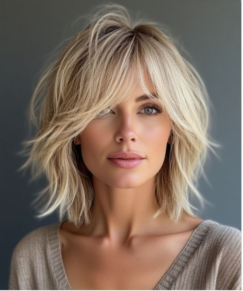 Sluoksniuoti vidutinio ilgio kirpimai ypač gerai veikia, jei sruogos nukreiptos ne į priekį, o nuo veido. Tai atveria bruožus, suteikia dinamikos ir lengvumo pojūtį. Akcentas čia – ne ką nors „paslėpti“, o teisingai subalansuoti proporcijas.