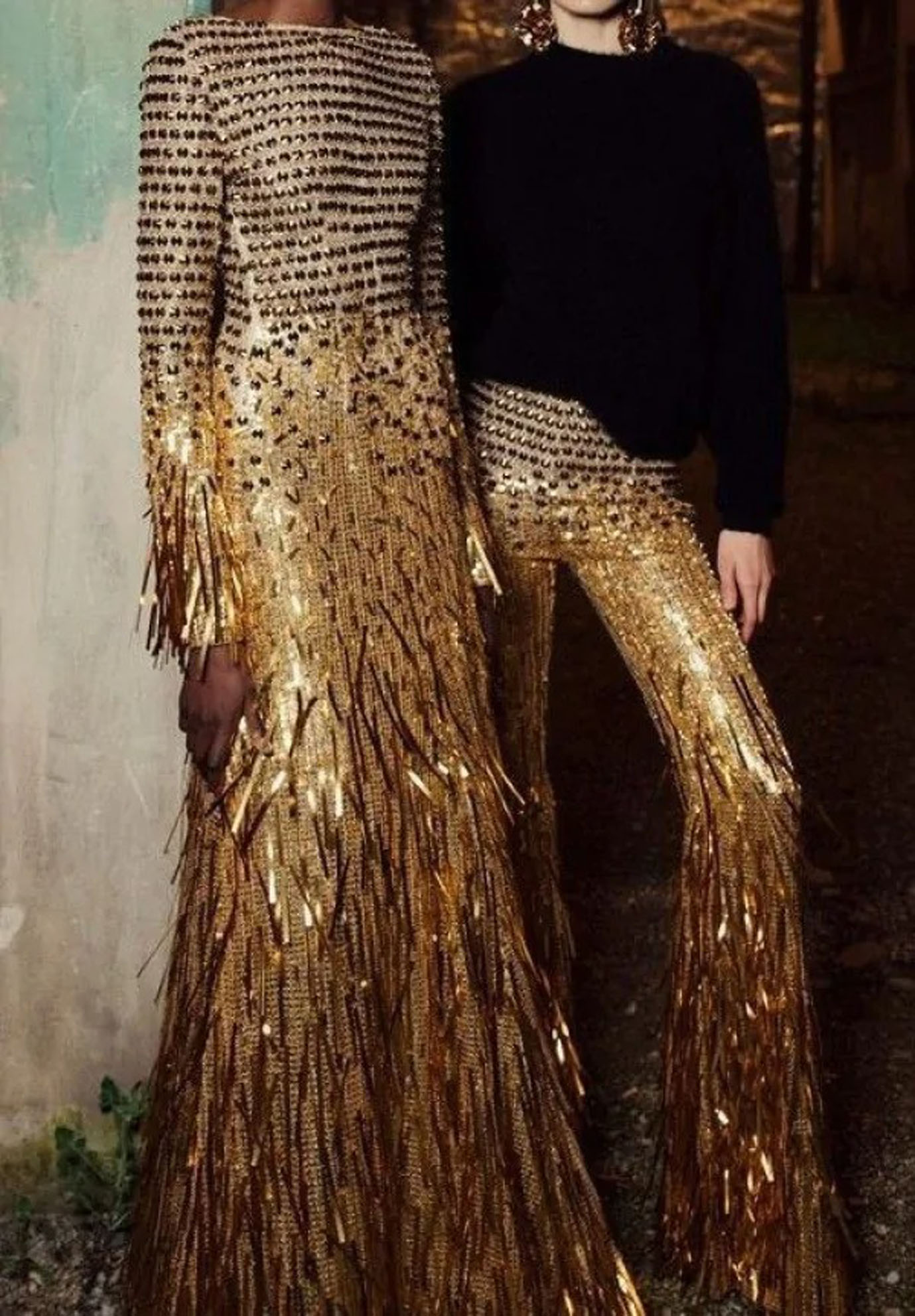 Drąsus akcentas: aukso spalvos kelnės ar kutais marginti sijonai - tikra šio sezono tendencija. Derinkite juos su klasikine juoda palaidine ir ryškiais papuošalais.