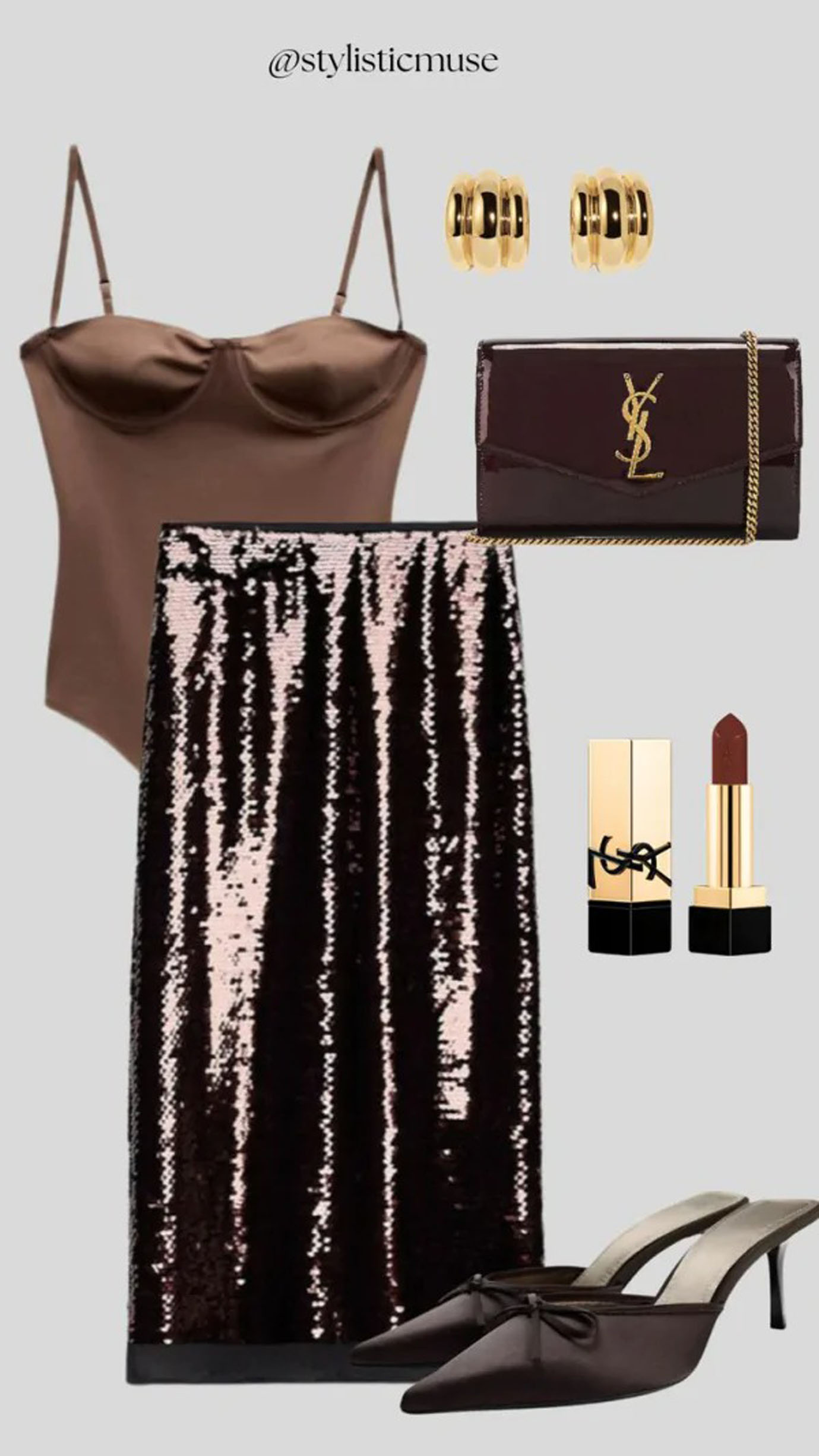 Kasdieniškesniam įvaizdžiui: šokolado spalvos midi sijonas, derinamas su karamelės spalvos palaidine, yra puikus pasirinkimas. Įvaizdį papildykite bateliais ir aukso spalvos aksesuarais.