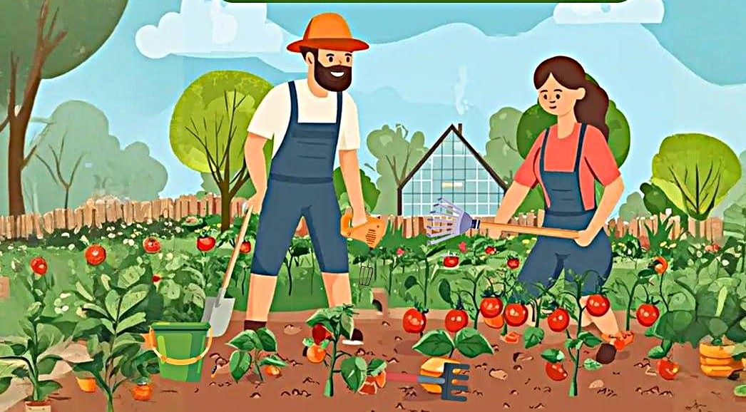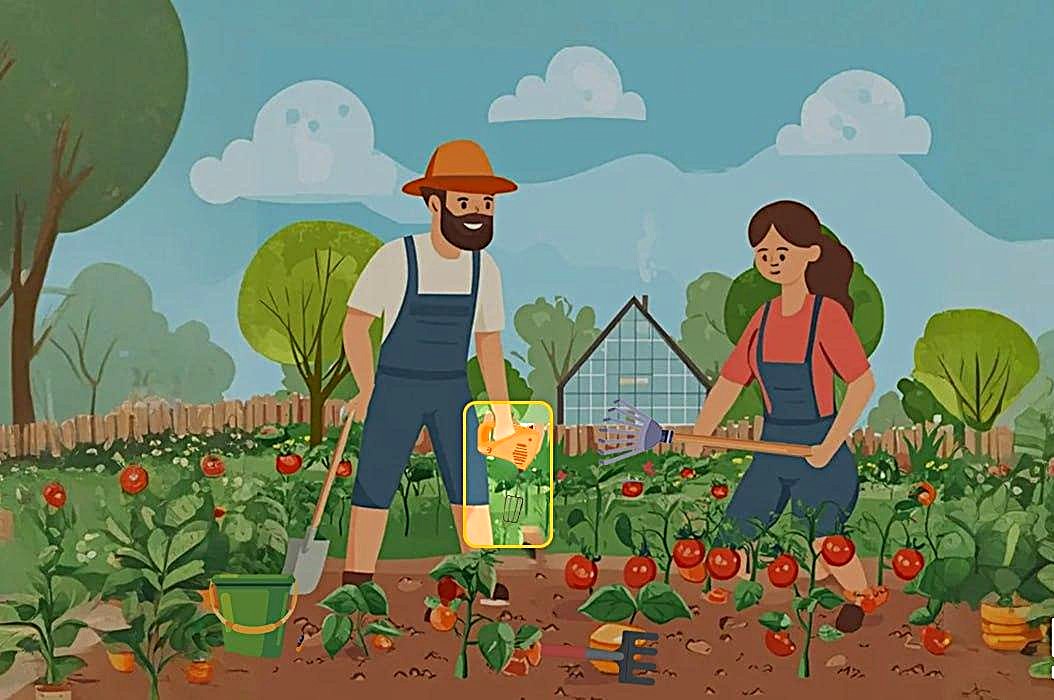Turite atidžiai įsižiūrėti į daržą, kuriame dirba du žmonės, ir atkreipti dėmesį į keistą detalę.
