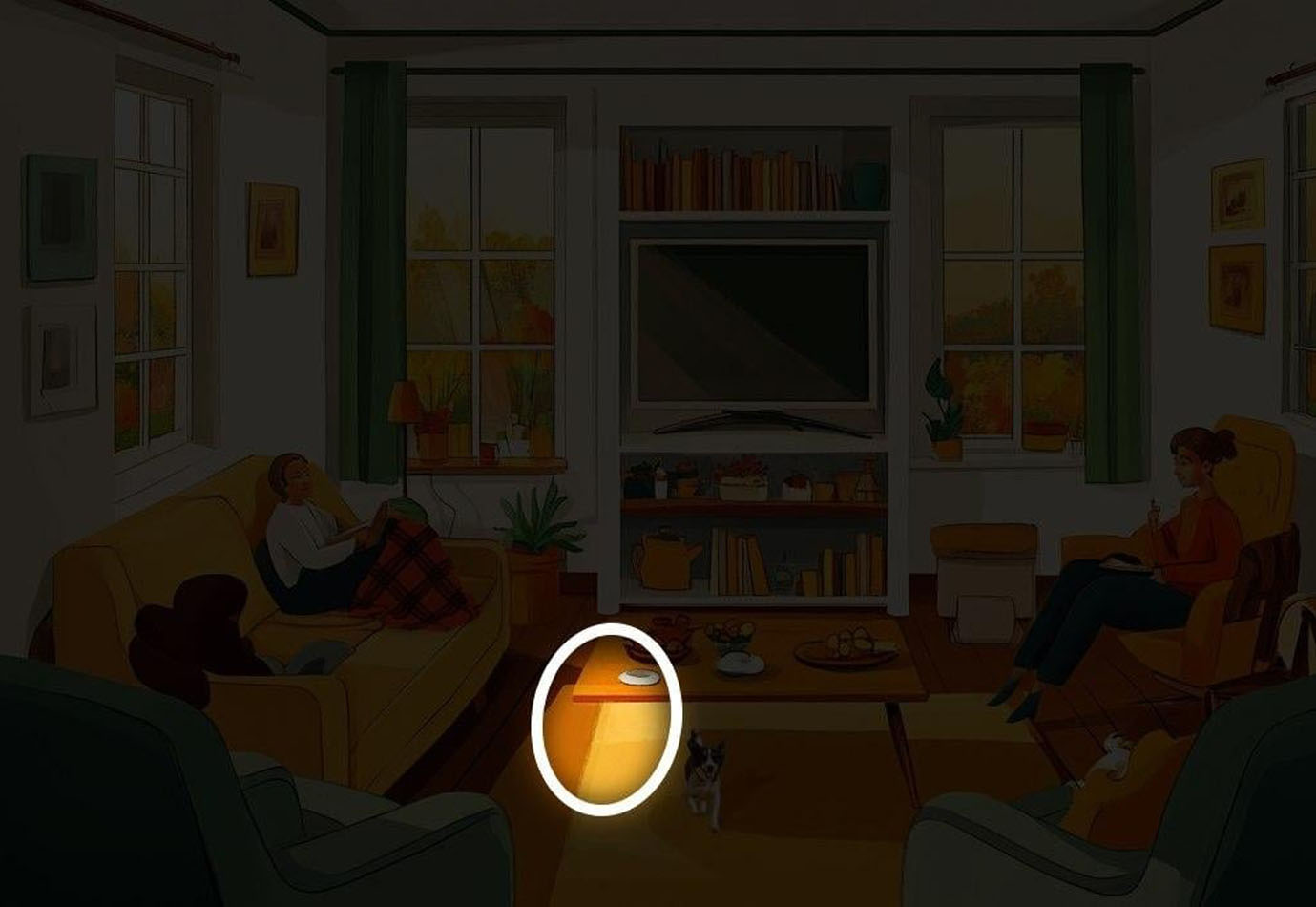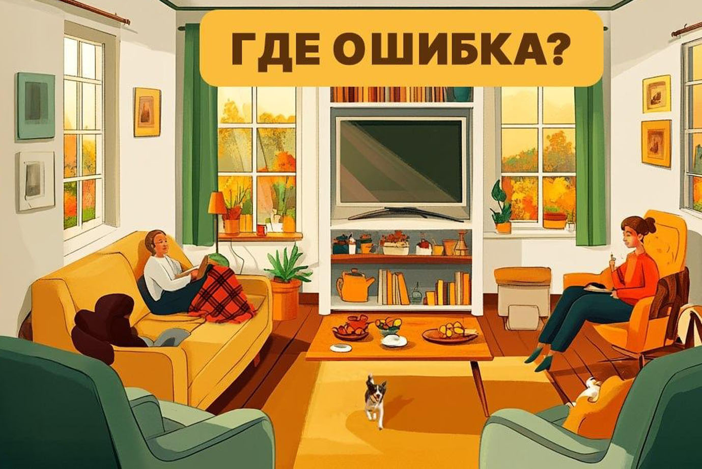 Toliau matysite jaukios svetainės, kurioje sėdi du žmonės ir bėgioja šuniukas, paveikslėlį. Tačiau šiame paveikslėlyje kažkas ne taip, o jūsų užduotis - nustatyti, kas tai yra.