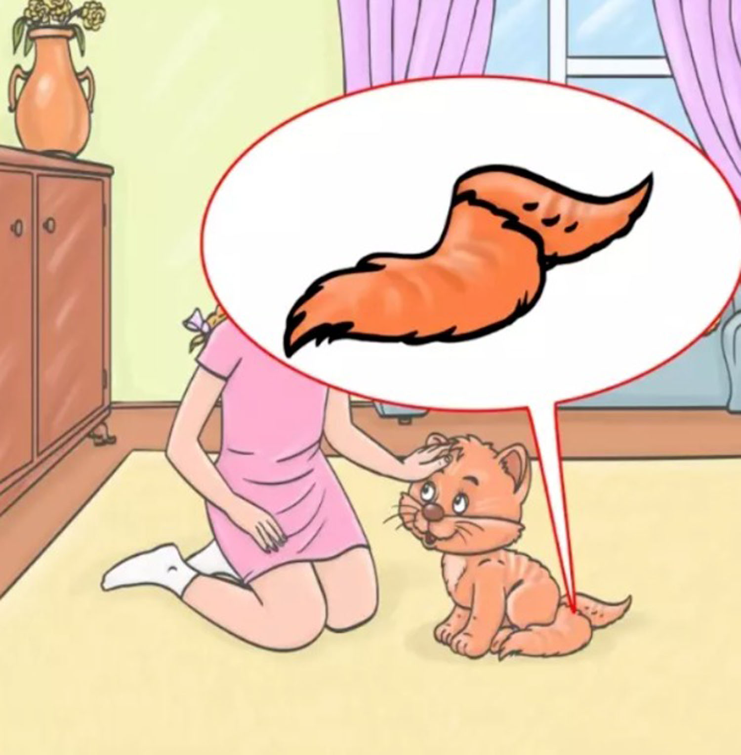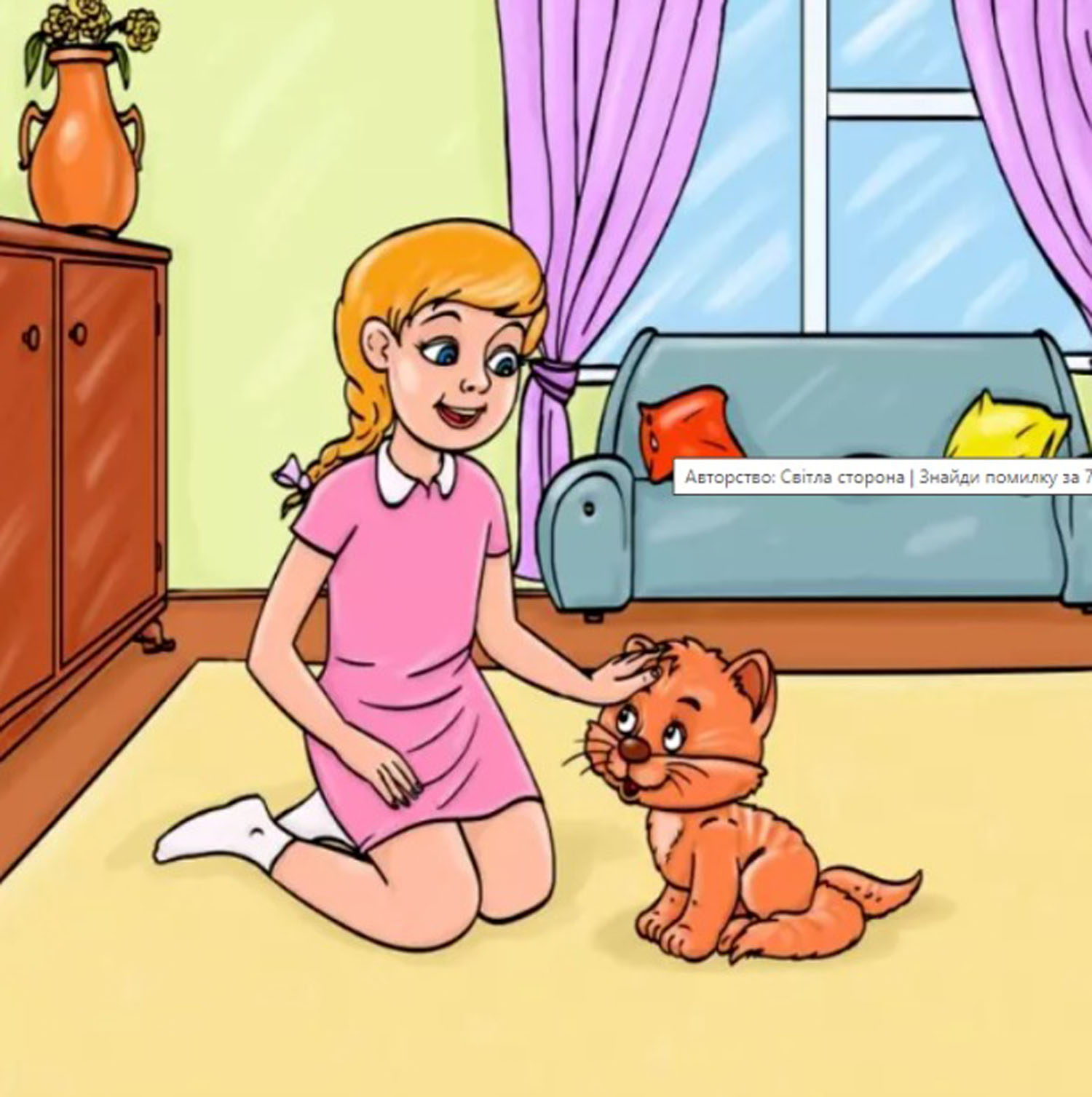 Paveikslėlyje matome mergaitę, sėdinčią savo kambaryje ant grindų ir glostančią kačiuką. Atrodo, kad tai nieko įprasto. Tačiau čia slypi klaida, kurią turime surasti per 7 sekundes. Taigi, kas paveikslėlyje ne taip?