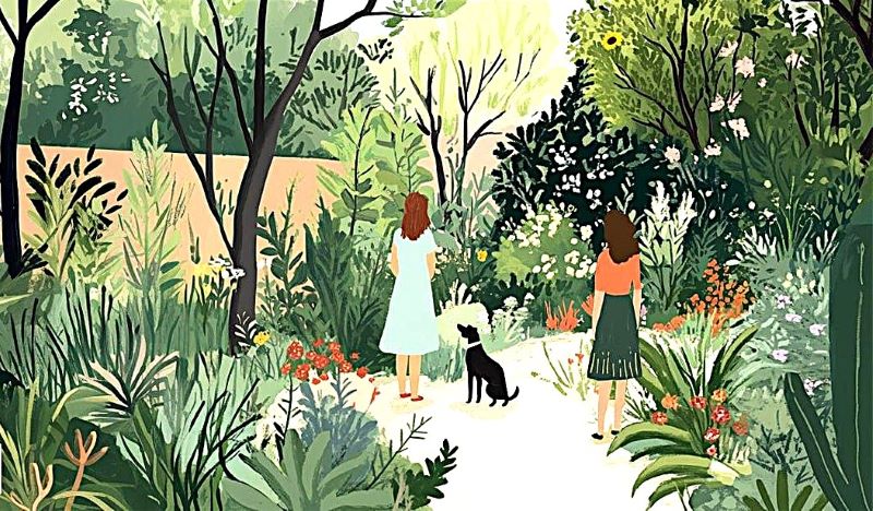 Priešais jus dvi merginos su šunimi vaikšto žydinčiame parke.