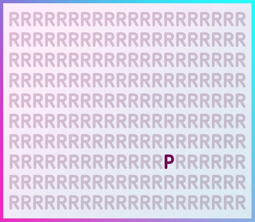 Taigi, raidė P pasislėpė trečioje eilutėje iš apačios, septinta iš dešinės. Beveik nepastebima, jei nežiūrėti atidžiai – bet būtent tai ir yra tokių užduočių esmė.