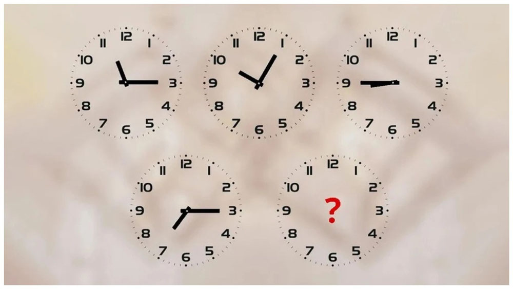 Paveikslėlyje – penkios valandos. Pirmieji keturi rodo laiką: 11:15, 10:05, 8:45 ir 7:15. Penktas – be rodyklių. Jūsų užduotis – išsiaiškinti, kokią valandą jos turėtų rodyti.