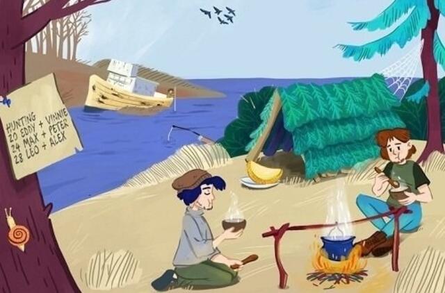 Paveikslėlyje matote stovyklavietę netoli paplūdimio ir du valgančius vyrus, ruošiančius valgį ant laužo.