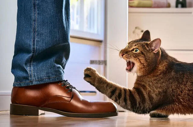 Mažam plėšrūnui mūsų kojos yra lengviausiai pasiekiamas taikinys kontaktui užmegzti. Kai įprastas miaukimas ar bandymai trintis galva yra ignoruojami, katė gali imtis radikalesnių metodų. Lengvas įkandimas ar staigus puolimas naudojant nagus dažnai yra desperatiškas bandymas atkreipti šeimininko dėmesį. Norint išvengti tokių atakų, reikėtų skirti laiko žaidimams su augintiniu dar prieš jam pradedant medžioklę.