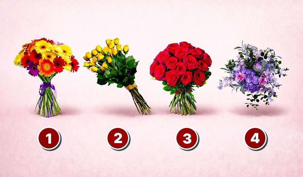 Iliustracijoje pavaizduotos keturios skirtingos puokštės, iš kurių jums reikia išsirinkti tik vieną. Pagalvokite, kurią iš šių gėlių kompozicijų šią akimirką labiausiai norėtumėte gauti dovanų. Ilgai nedvejokite, antraip atsakymas nebus nuoširdus. Atminkite, kad testo rezultatas atspindi tik dabartinę jūsų psichologinę būseną, tad po kurio laiko pasirinkimas gali pasikeisti.