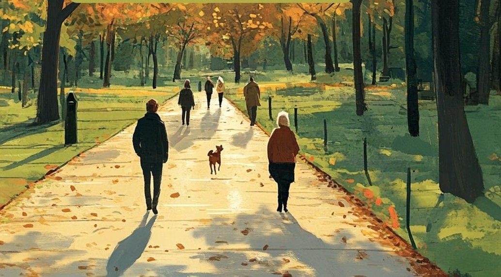 Paveikslėlyje pavaizduoti parke neskubėdami vaikštinėjantys žmonės.