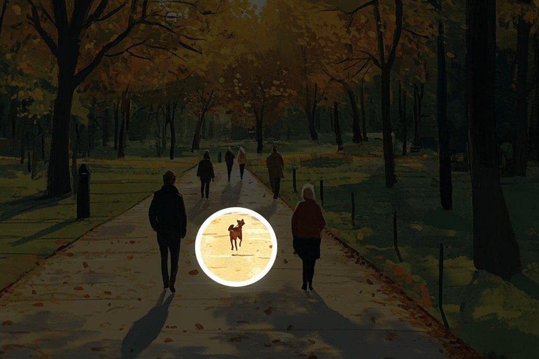 Visi einantys žmonės turi šešėlį, tačiau šalia jų bėgantis šuo kažkodėl jo neturi.