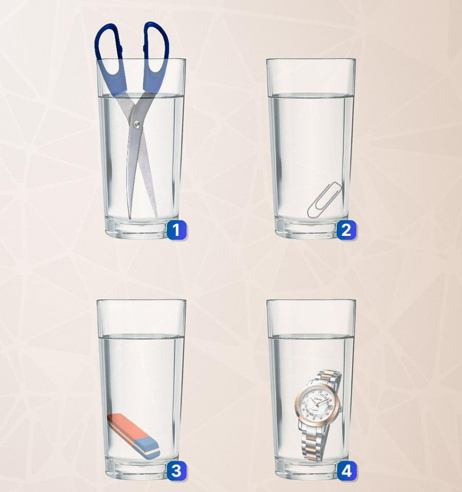 Šiandien UNIAN siūlo jums galvosūkį, kurį išspręsti gali tik labai atidūs žmonės. Priešais jus - keturios stiklinės vandens, į kiekvieną iš jų įdėti skirtingi daiktai: žirklės, segtuvas, gumytė ir rankinis laikrodis. Per mažiau nei 8 sekundes turite nustatyti, kurioje stiklinėje yra daugiau vandens.