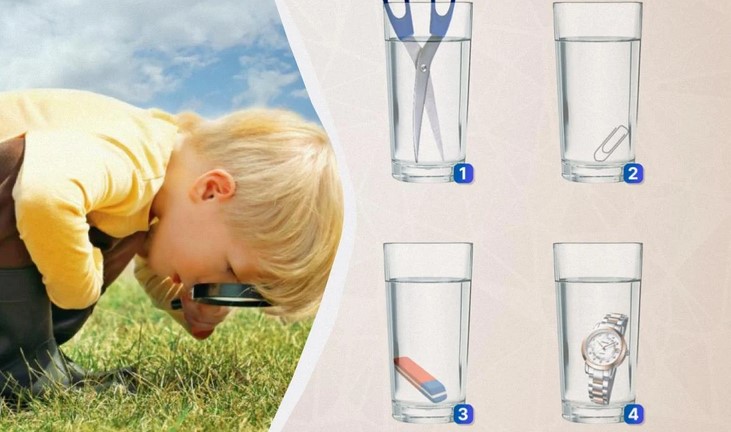 Priešais jus - keturios stiklinės vandens, į kiekvieną iš jų įdėkite skirtingus daiktus: žirkles, segtuvą, gumytę ir rankinį laikrodį.