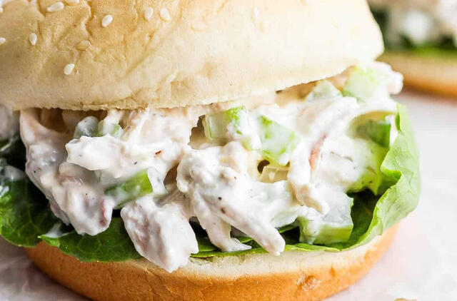 Sudėkite plėšytą vištieną į dubenį ir sumaišykite su padažu.