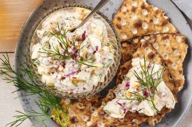 Silkę sumaišykite su svogūnais, krapais, bulvėmis, kiaušiniais, grietine, majonezu ir ikrais.