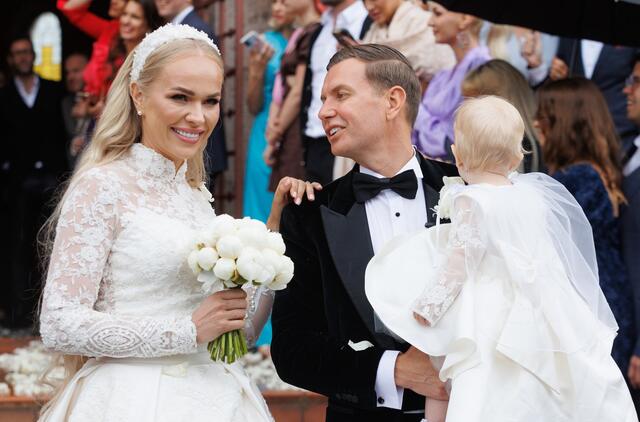 Jaunavedžiai prabangiu juodu automobiliu atvyko drauge su vaikais. Ieva vilkėjo prirenkiančią baltą suknelę, o Andrius puošėsi juodu kostiumu.